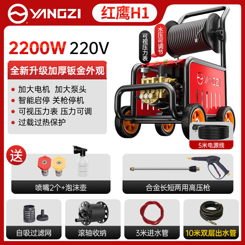 揚子紅鷹洗車機高壓清洗機家用220V大功率洗車高壓水槍刷車泵神器庭院清洗,可視可調壓力表,高低水壓輕松掌握,針對不同使用場景選擇合適壓力