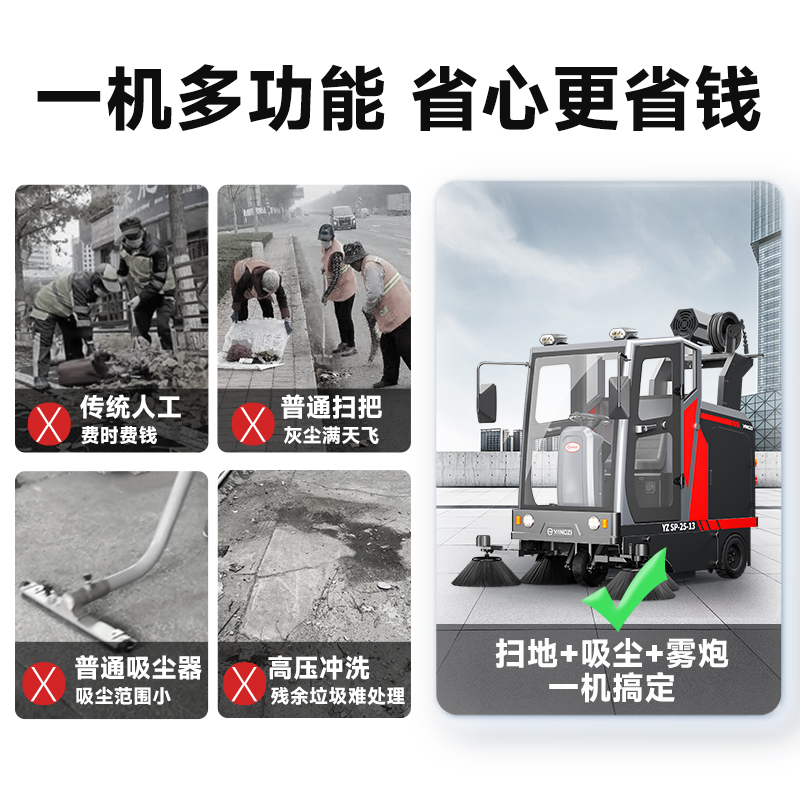 室外駕駛式掃地車掃地/吸塵/排噴,每小時清掃21000㎡,清掃寬度2100mm,續航時間4-5h,后排噴前噴霧雙功能,不用擔心滿天的灰塵。